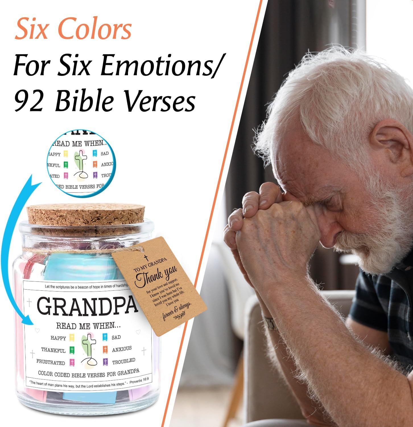 - This jar comes with 92 carefully selected Bible verses, thoughtfully color-coded will be a guiding light, offering comfort, wisdom, and encouragement whenever grandpa needs it most.